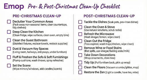 Feeling overwhelmed? Book an expert cleaner from eMop. Our pros handle post-holiday mess with care and efficiency — so you can relax and enjoy the season.